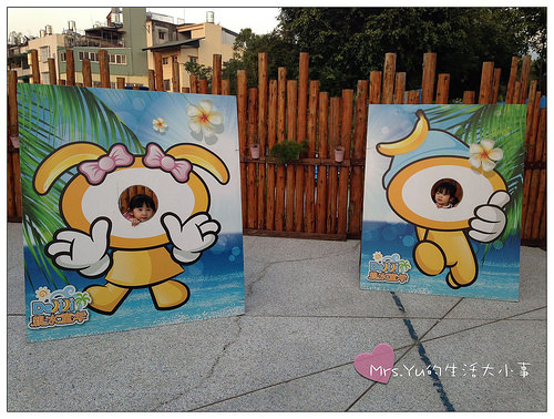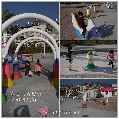 戶外有夏天玩水的一些設施,不過現在沒水,我們也只能過過"乾"癮...