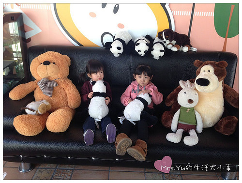 一進到餐廳裡頭,門口沙發區就有一堆玩偶,還有一排魚丸最愛的大貓熊,