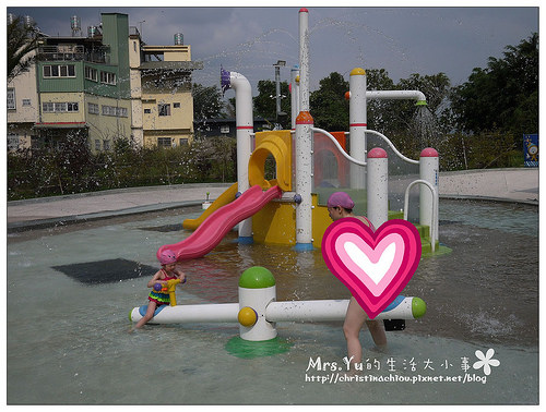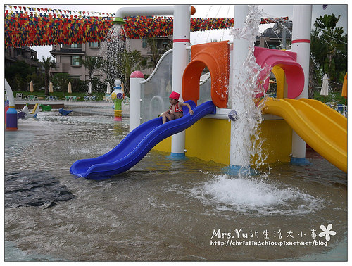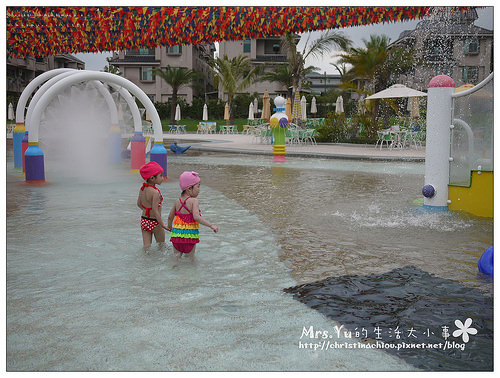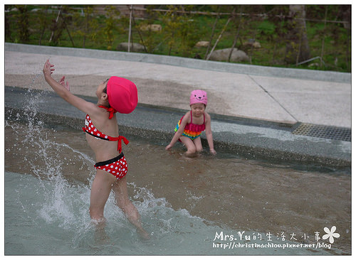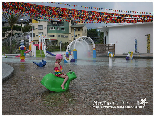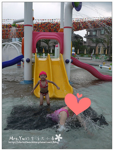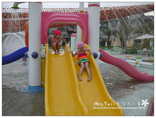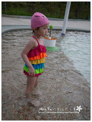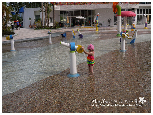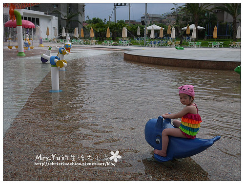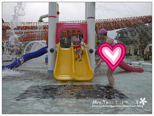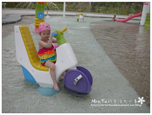 膽小的魚丸一開始完全不敢下水玩任何的設施,所以阿沐先讓她從噴水青蛙、噴水鯨魚開始玩起,